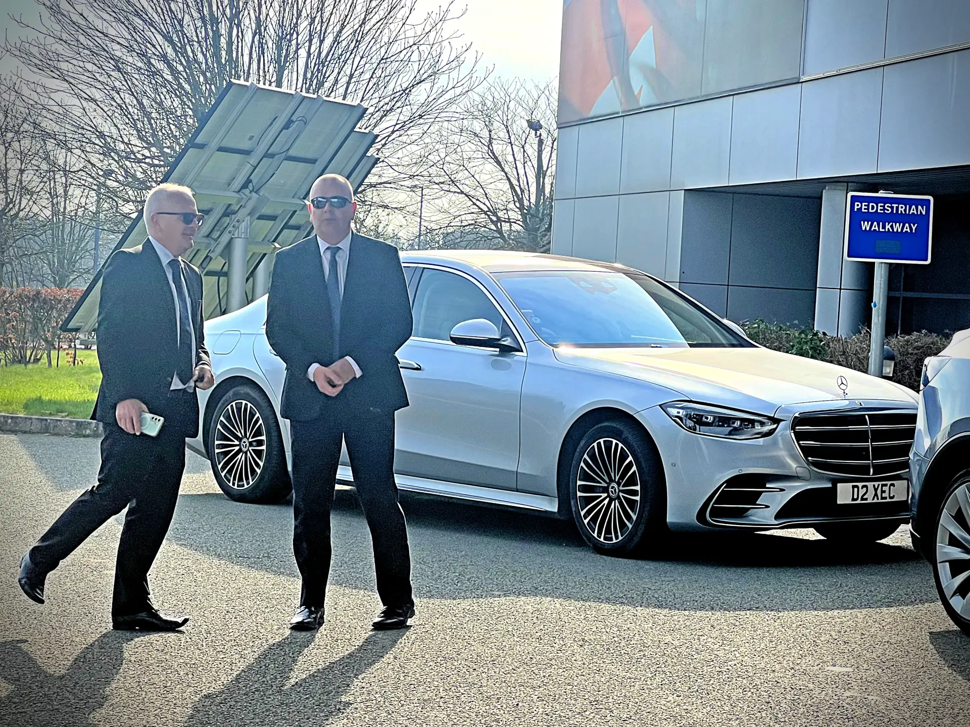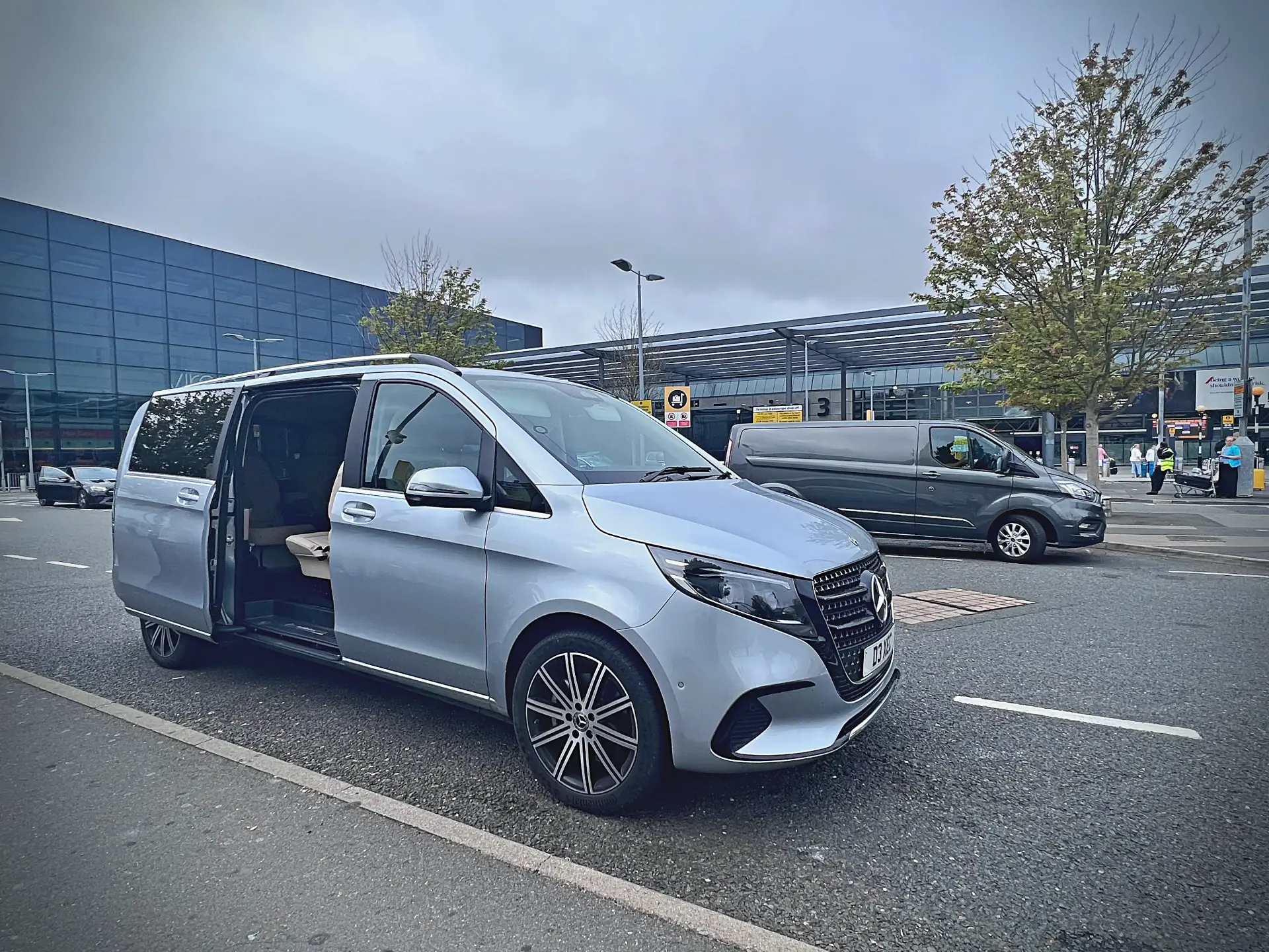 Mercedes S Class chauffeur vehicle outside airport terminal for executive transfer